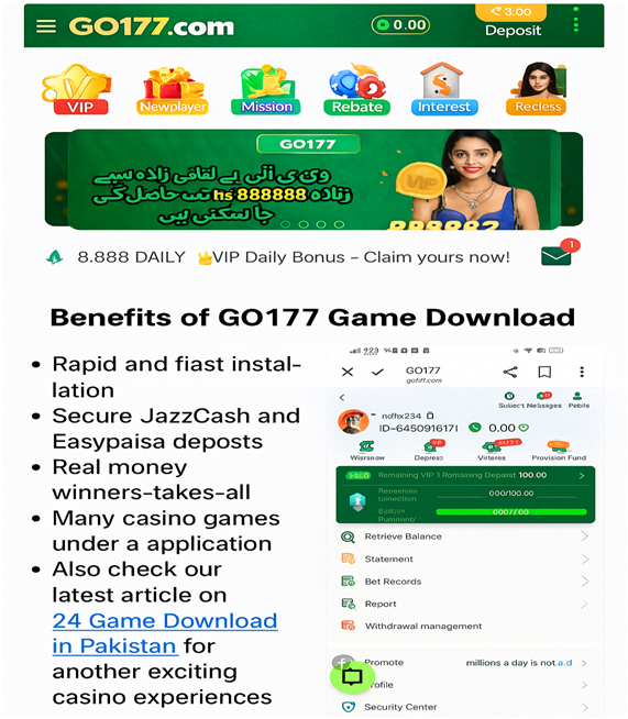 The GO177 Game download is a popular online casino app in Pakistan, offering players exciting options like slot machines, card games, spin wheels, and other betting challenges. Unlike regular casino platforms, this game is built with localized features, including fast deposits and withdrawals through JazzCash and Easypaisa, quick installation steps, and smooth mobile compatibility.